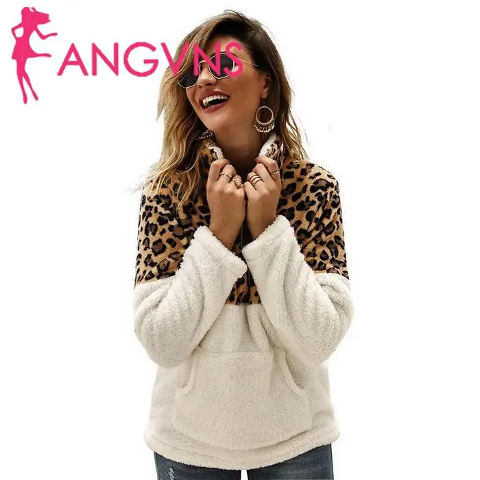 Special Offer ANGVNS léopard Patchwork fausse fourrure sweat à manches longues poches chaud polaire pull décontracté en peluche sweat à capuche col roulé Discount 20% Today!