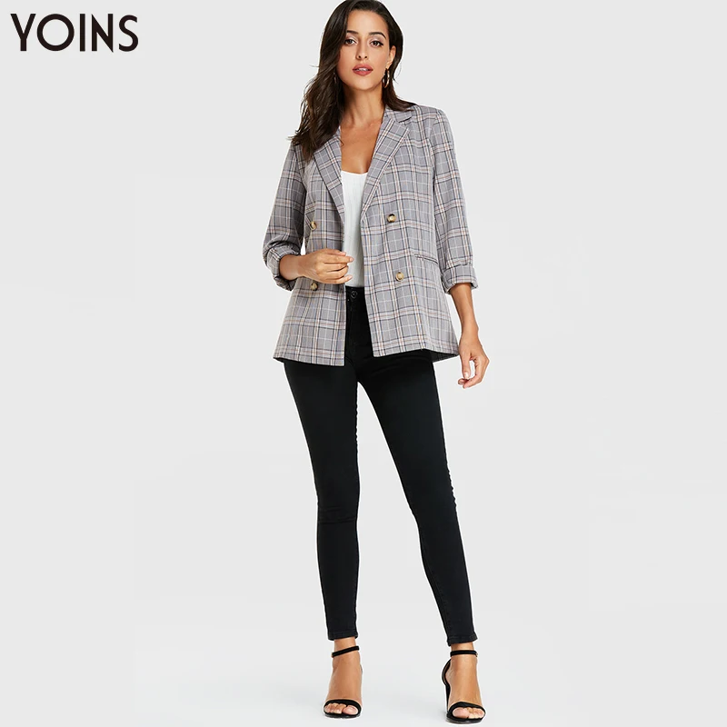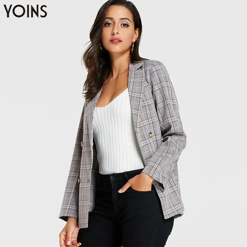 Special Offer YOINS 2019 automne hiver Blazer femmes vestes manteaux grille double boutonnage revers manches longues Feminino gris décontracté travail Streetwear Discount 32% Today!