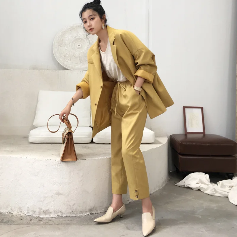 . (32% Off) Achat Costume femme 2019 automne nouveau tempérament décontracté lâche long costume veste pantalon couleur unie élégant mode deux pièces ensemble Pas Cher Prix.