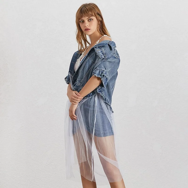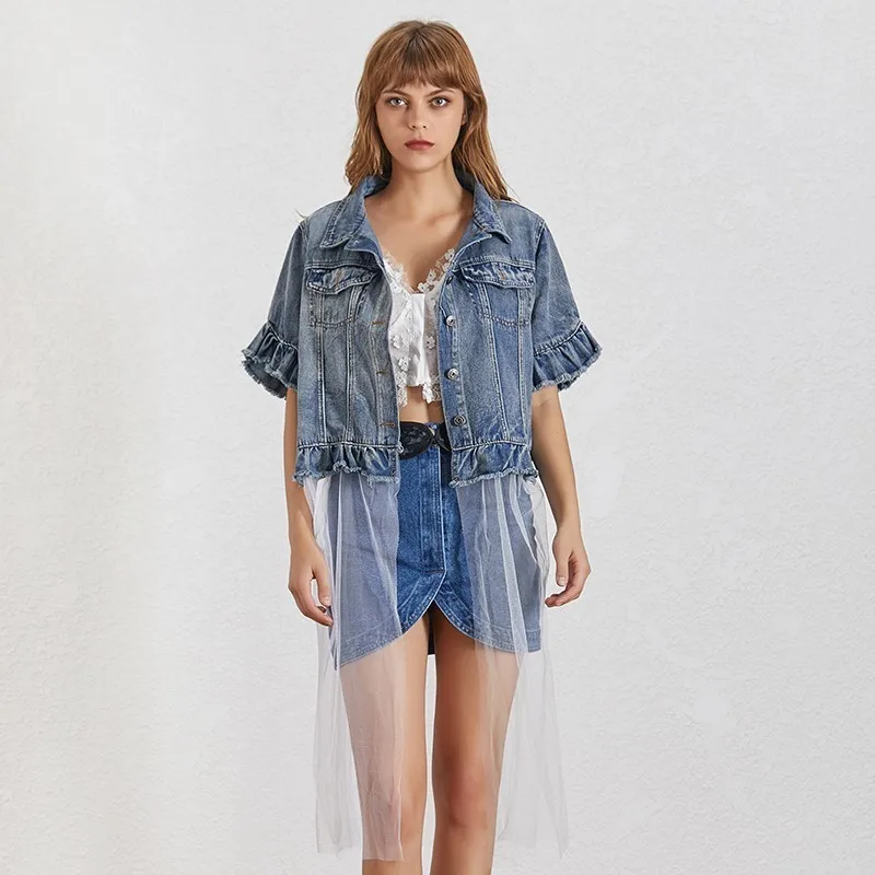 Special Offer Deuxtwinstyle été maille Patchwork femmes veste revers à manches courtes volants bouton lâche Denim manteau femme mode 2019 nouveau Discount 44% Today!