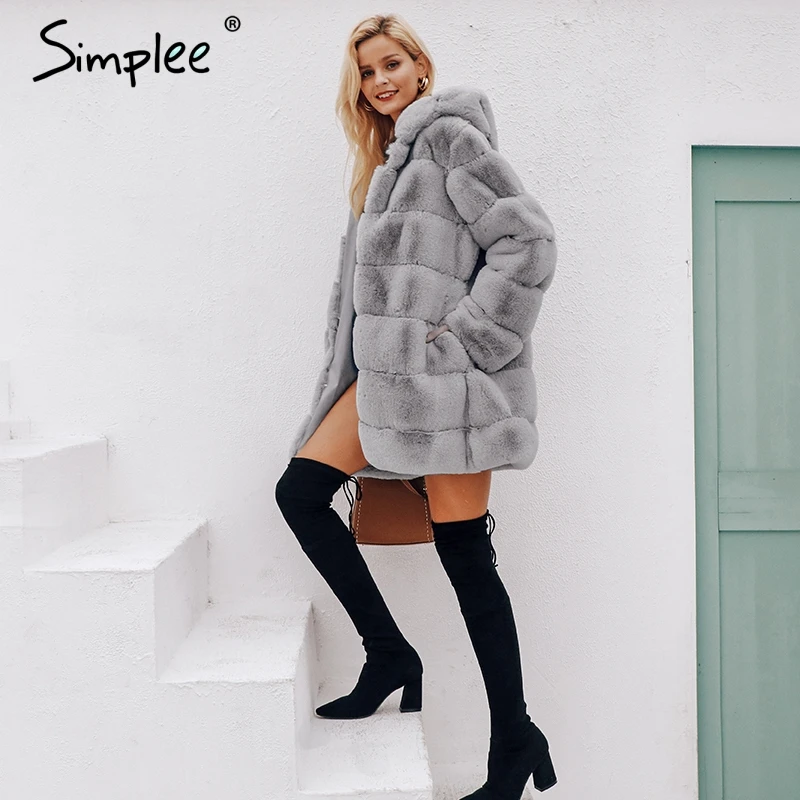 Special Offer Simplee Vintage moelleux à capuche fausse fourrure manteau femmes hiver gris veste manteau femme grande taille chaud long vêtements d extérieur décontractés pardessus Discount 50% Today!