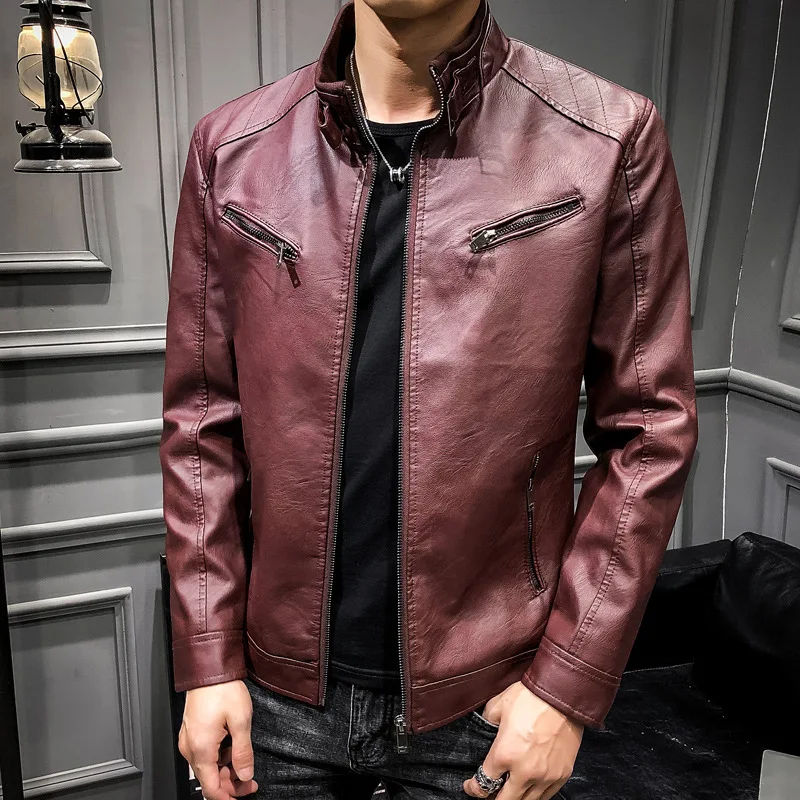 . (40% Off) Achat Nouvelle arrivée hommes en cuir synthétique vestes solide mince col montant fermeture éclair mode manteau moto en cuir veste hommes manteaux Pas Cher Prix.