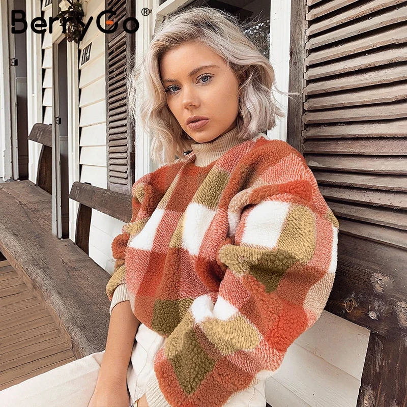. (46% Off) Vente BerryGo Vintage laine d agneau plaid vestes à capuche femmes sweat col rond pull en vrac femme sweat automne hiver dames manteaux chauds Pas Cher En Ligne.