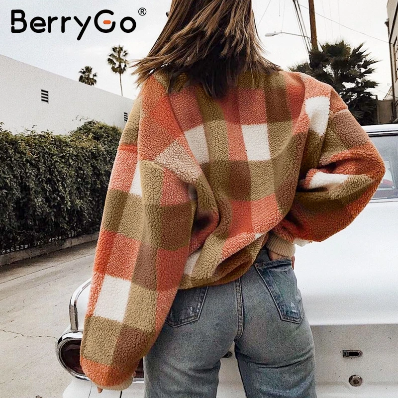 Special Offer BerryGo Vintage laine d agneau plaid vestes à capuche femmes sweat col rond pull en vrac femme sweat automne hiver dames manteaux chauds Discount 46% Today!