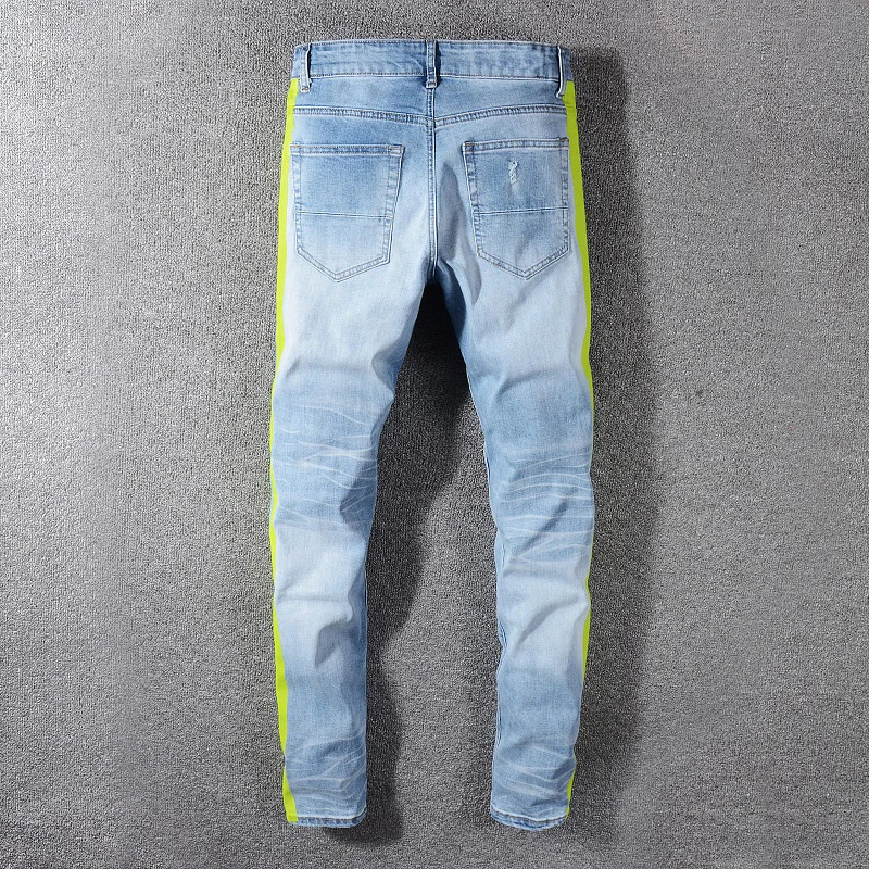. (30% Off) Achat Sokotoo hommes néon jaune couleur lignes patchwork déchiré jean mode trous détruit denim stretch pantalon Pas Cher Prix.