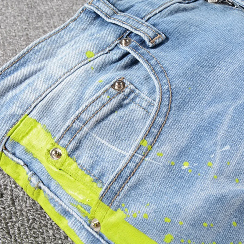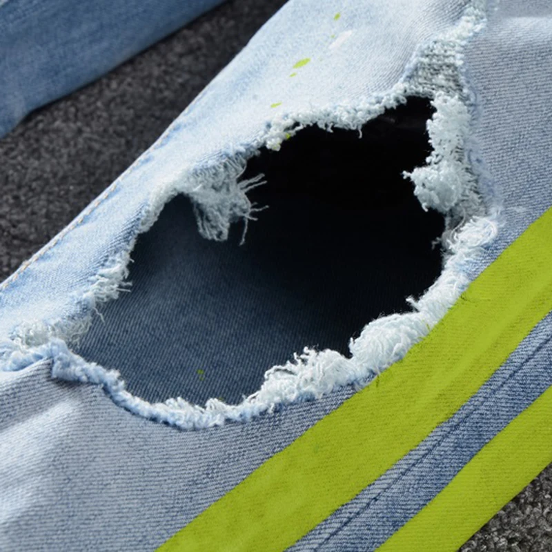 Special Offer Sokotoo hommes néon jaune couleur lignes patchwork déchiré jean mode trous détruit denim stretch pantalon Discount 30% Today!