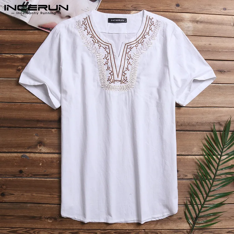 Special Offer INCERUN hommes chemises à manches courtes coton col en v Chic broderie t shirt décontracté couleur Pure quotidien sauvage basique littéraire t shirt Masculina Discount 31% Today!