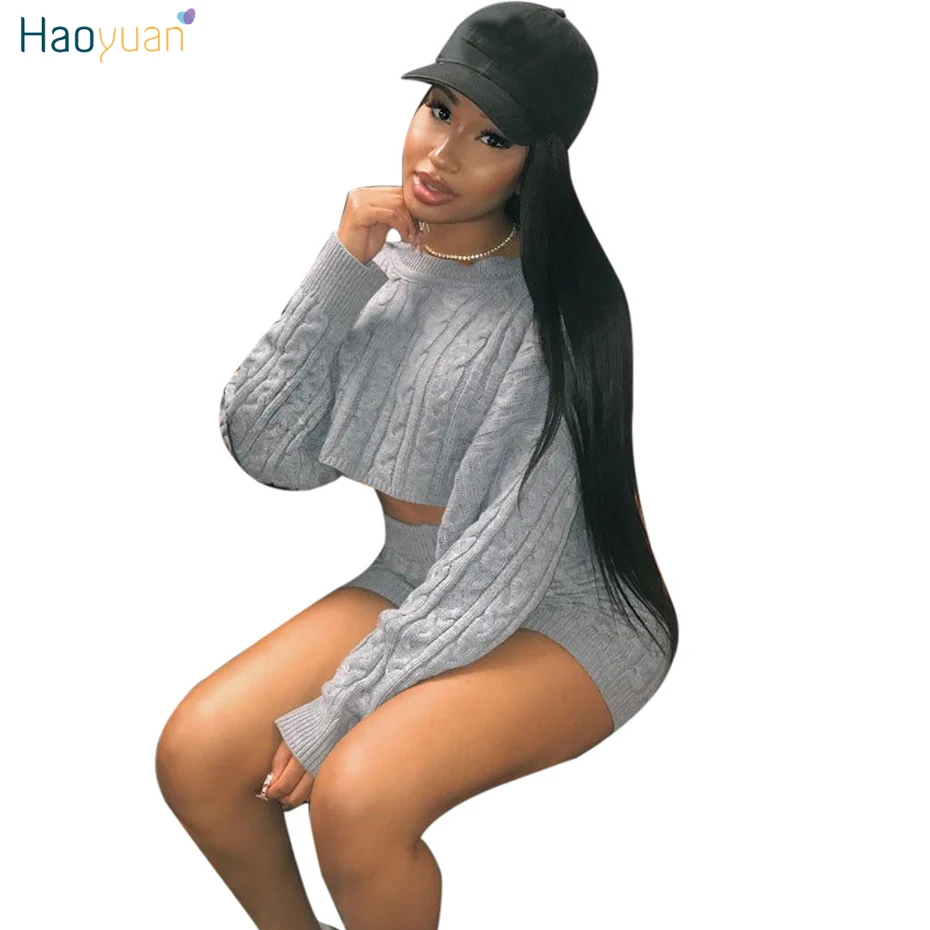 Special Offer HAOYUAN femmes deux pièces ensemble Sexy Club tenues pull Crop hauts et Biker Shorts vêtements tricotés survêtement 2 pièces ensembles assortis Discount 44% Today!
