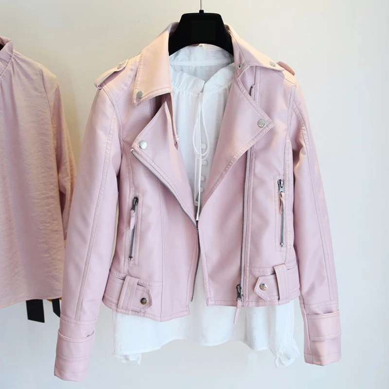 Special Offer Femme printemps automne PU cuir veste Biker manteau Faux cuir vestes noir rose Rivet Zipper moto vestes basique Outwear Discount 46% Today!