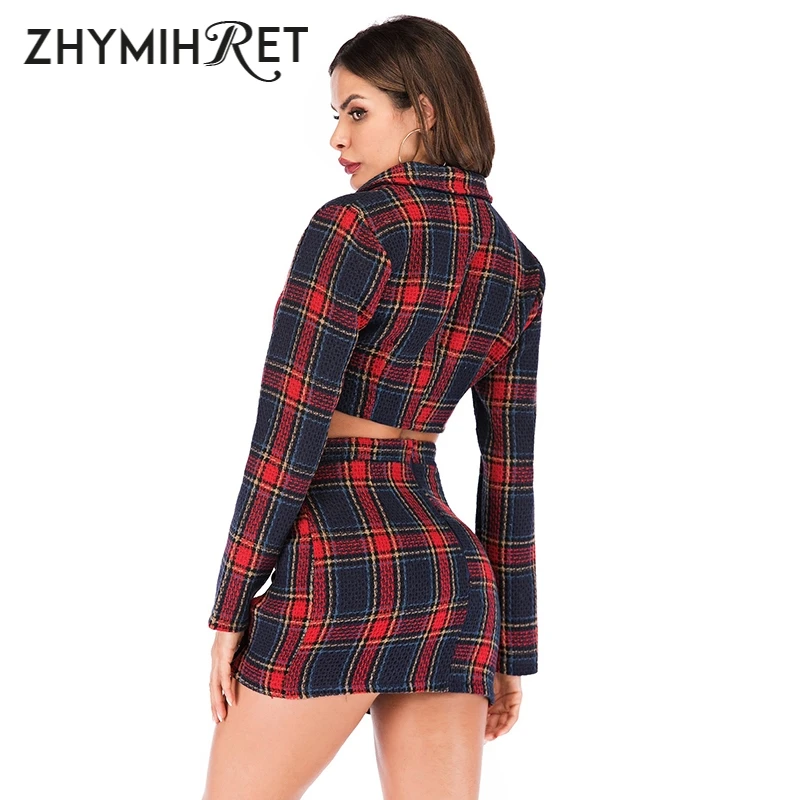 Special Offer ZHYMIHRET automne hiver 2 pièces ensemble robe à carreaux haut court femmes à manches longues veste et jupe crayon deux pièces ensemble ensembles assortis Discount 30% Today!