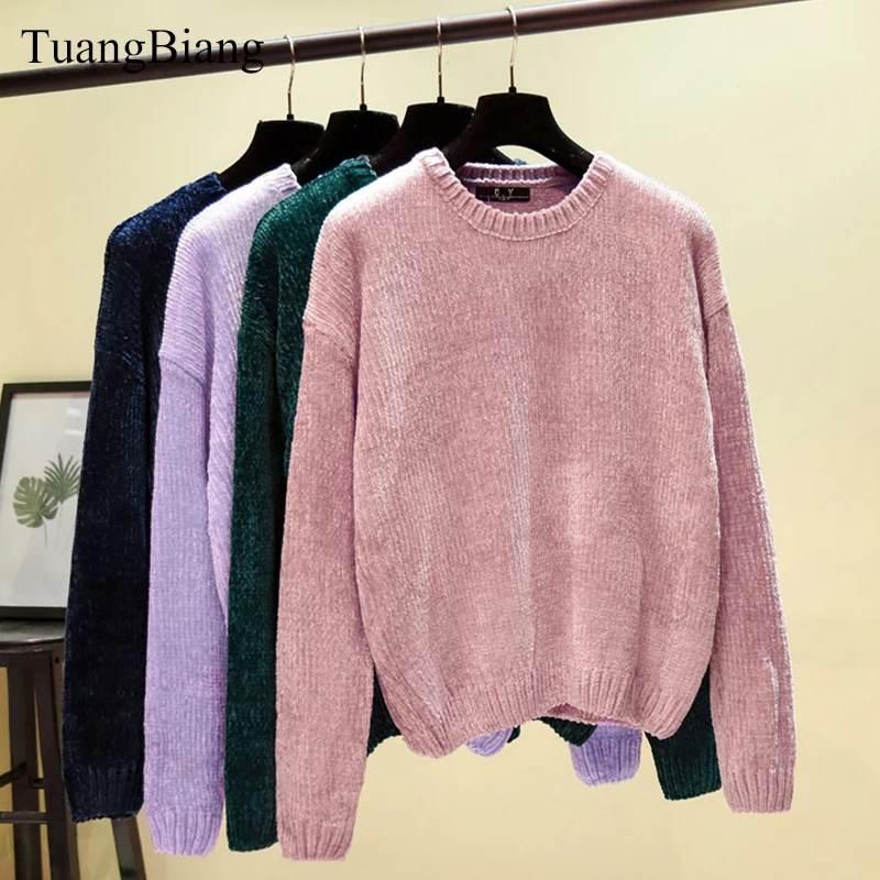 Special Offer Chic Vintage chenille cachemire femmes à manches longues or velours chandails hiver dames couleur unie o cou lâche femme pulls 2019 Discount 38% Today!