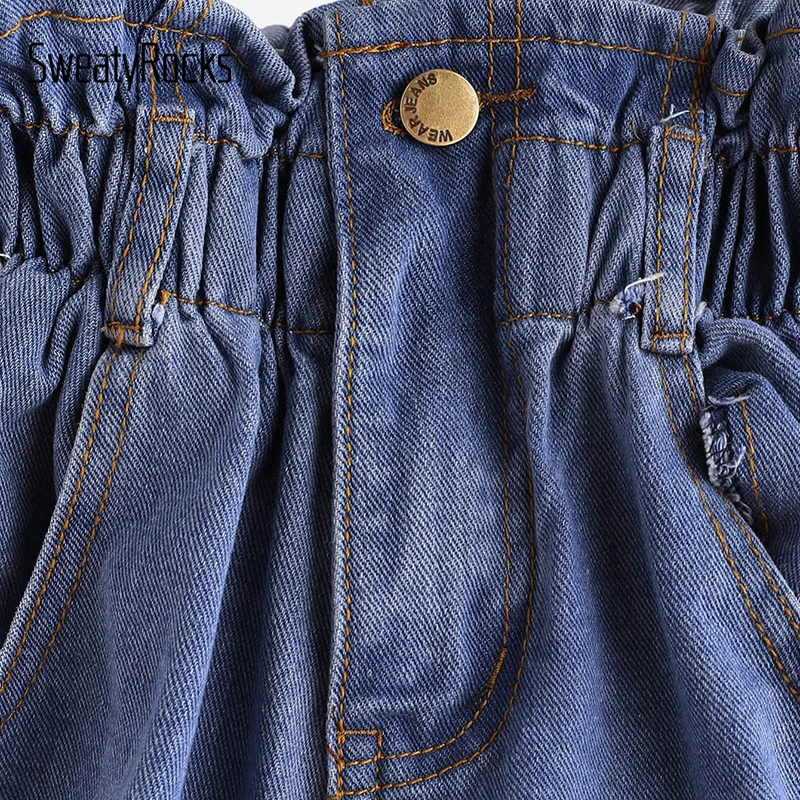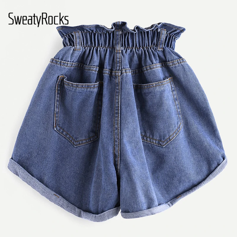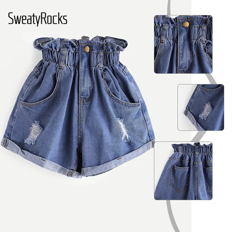 Special Offer SweatyRocks taille élastique déchiré Denim Shorts femmes Streetwear taille haute poches Shorts 2019 été bouton Fly solide Shorts Discount 40% Today!