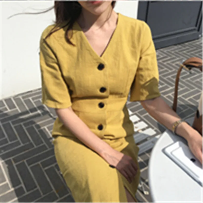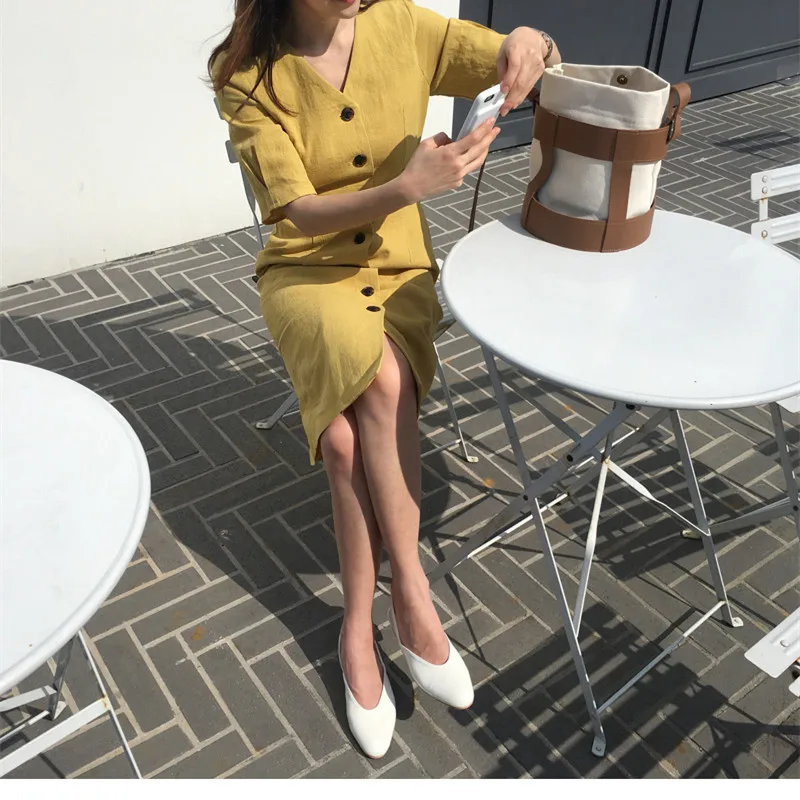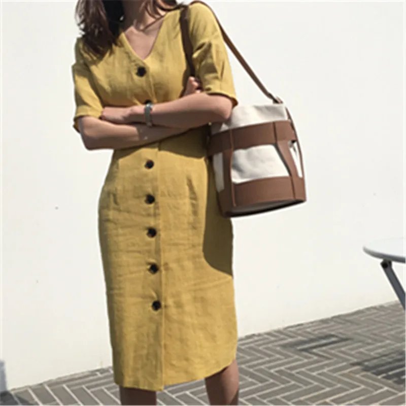 Special Offer Nouvelle Robe d été femmes coton lin OL décontracté demi manches robes Robe Femme col en V solide Robe jaune Boho Robe Femme Vestido Discount 50% Today!