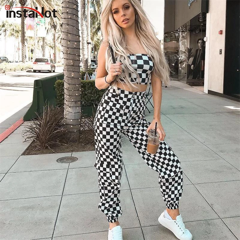 Special Offer Pantalon de survêtement décontracté InstaHot Plaid crayon femmes poches pleine longueur chaîne Polyester Pantalon femme lâche Pantalon à carreaux mode Discount 40% Today!