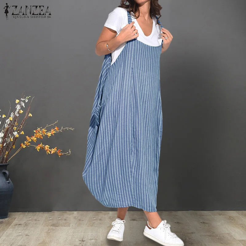 Special Offer ZANZEA été femmes à bretelles poches rayé robe lâche salopette décontracté robe dames fête robe d été Femme Sarafans bretelles Discount 41% Today!