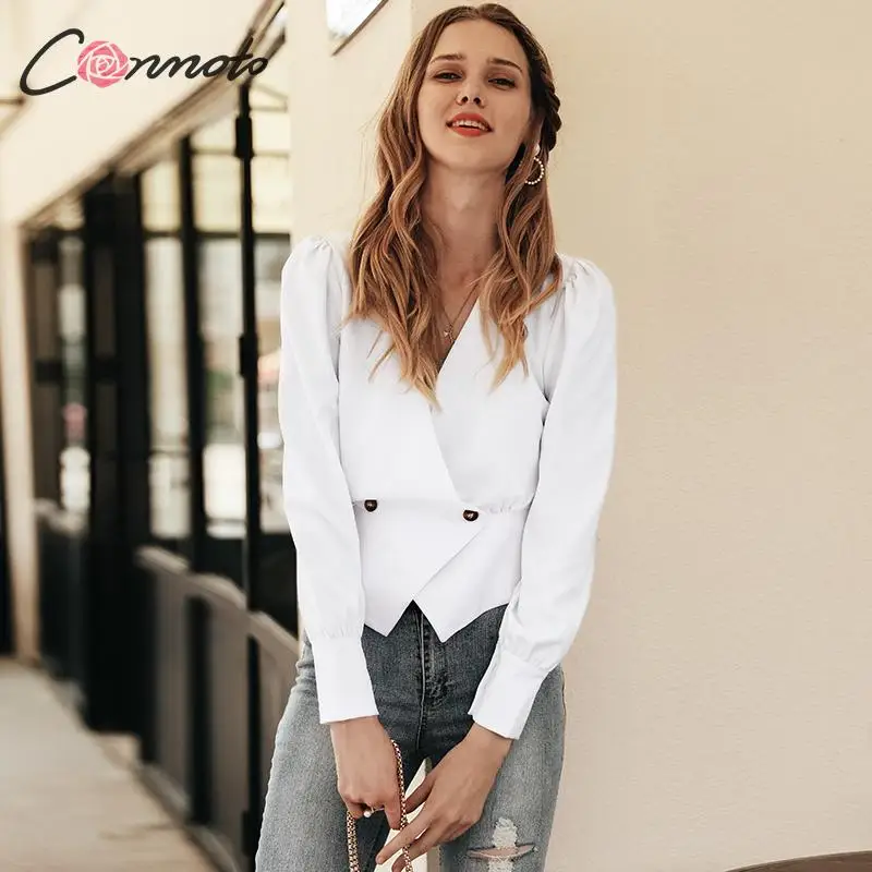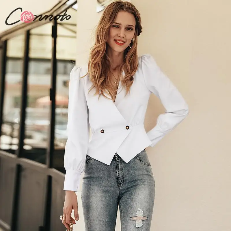 Special Offer Conmoto élégant solide femmes Blouse chemises Vintage rétro Peplum blanc col en V femmes Blouses bouffée décontracté Blusa Mujer Discount 42% Today!