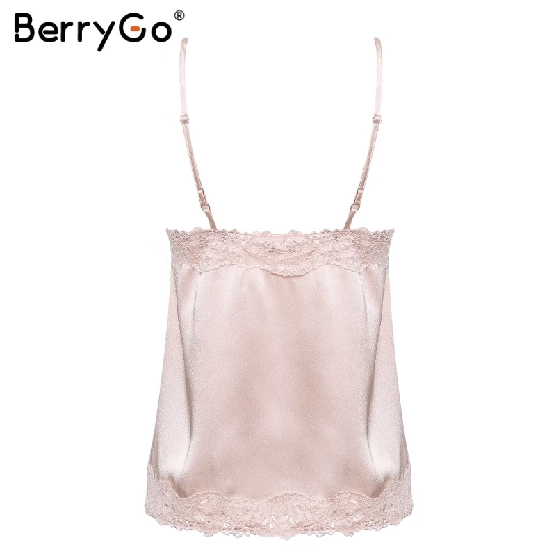 Special Offer BerryGo Sexy dentelle blanc satin camis été camisole Spaghetti sangle rose débardeur hauts femmes élégant boutons streetwear dames chemise Discount 40% Today!