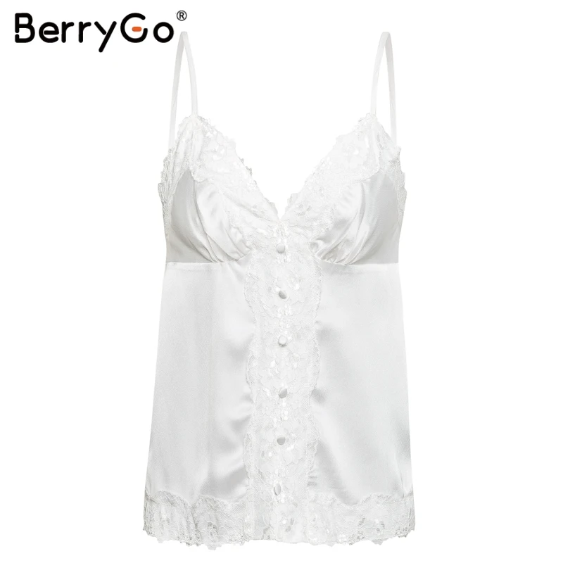 . (40% Off) Vente BerryGo Sexy dentelle blanc satin camis été camisole Spaghetti sangle rose débardeur hauts femmes élégant boutons streetwear dames chemise Pas Cher Prix.
