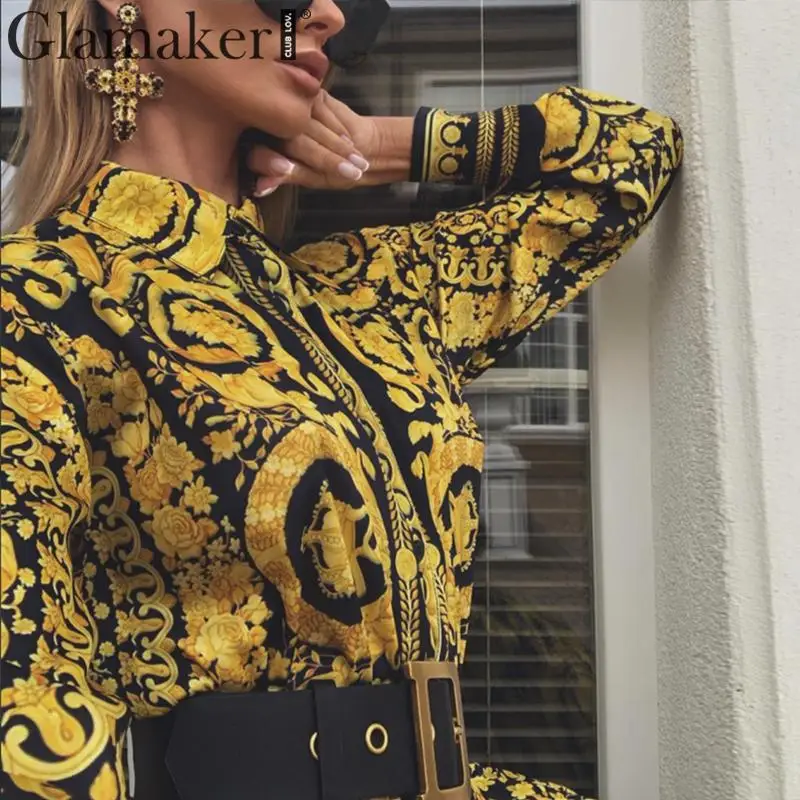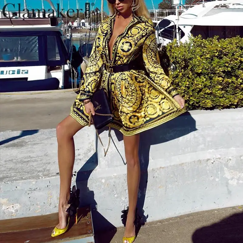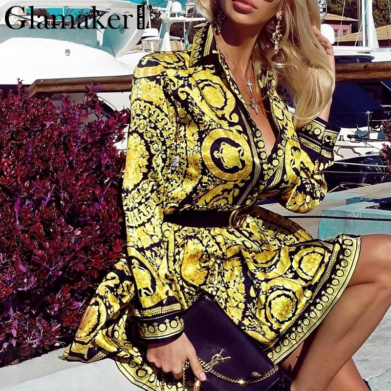 Special Offer Glamaker Sexy paisley vintage impression or robe femmes col en v courte blouse robe automne élégant fête club robe grande taille robe Discount 49% Today!