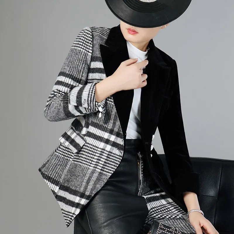 . (59% Off) Vente Deuxtwinstyle velours Patchwork laine Plaid Blazer manteau femme à manches longues asymétrique femmes costumes 2019 printemps mode vêtements Pas Cher Prix.