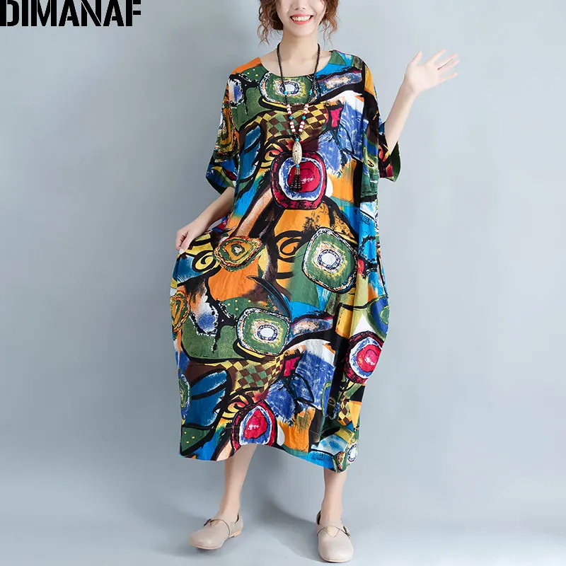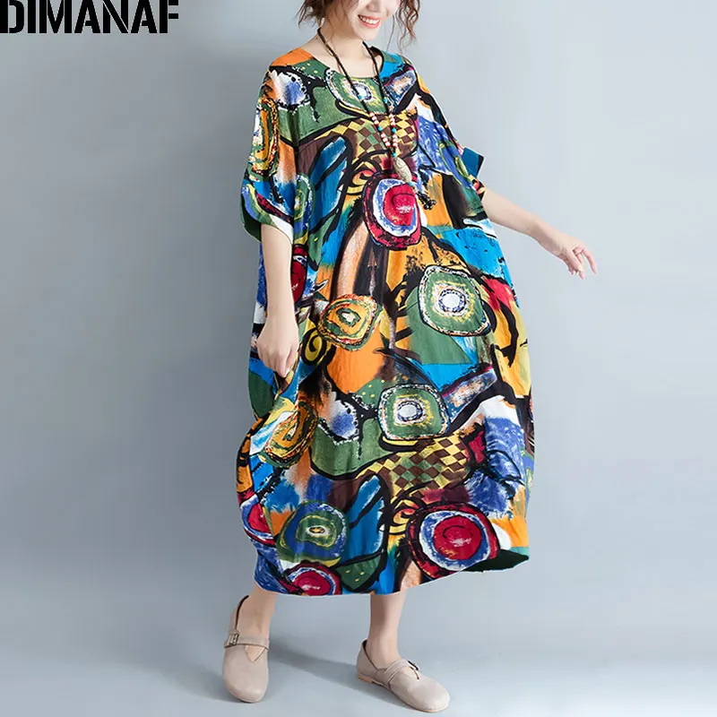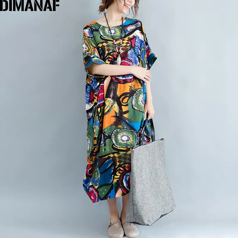 Special Offer DIMANAF femmes robe grande taille été motif imprimé lin coloré femme lâche chauve souris décontracté rétro Vintage grande taille robes Discount 52% Today!