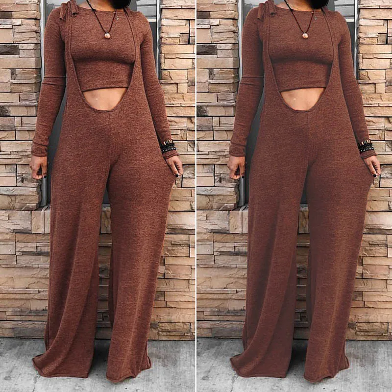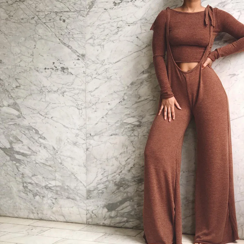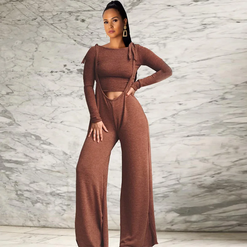 . (42% Off) Achat Echoine automne mode deux pièces ensemble bavoir pantalon solide café couleur costume manches longues haut + Long large pantalon femmes deux pièces tenues Pas Cher En Ligne.