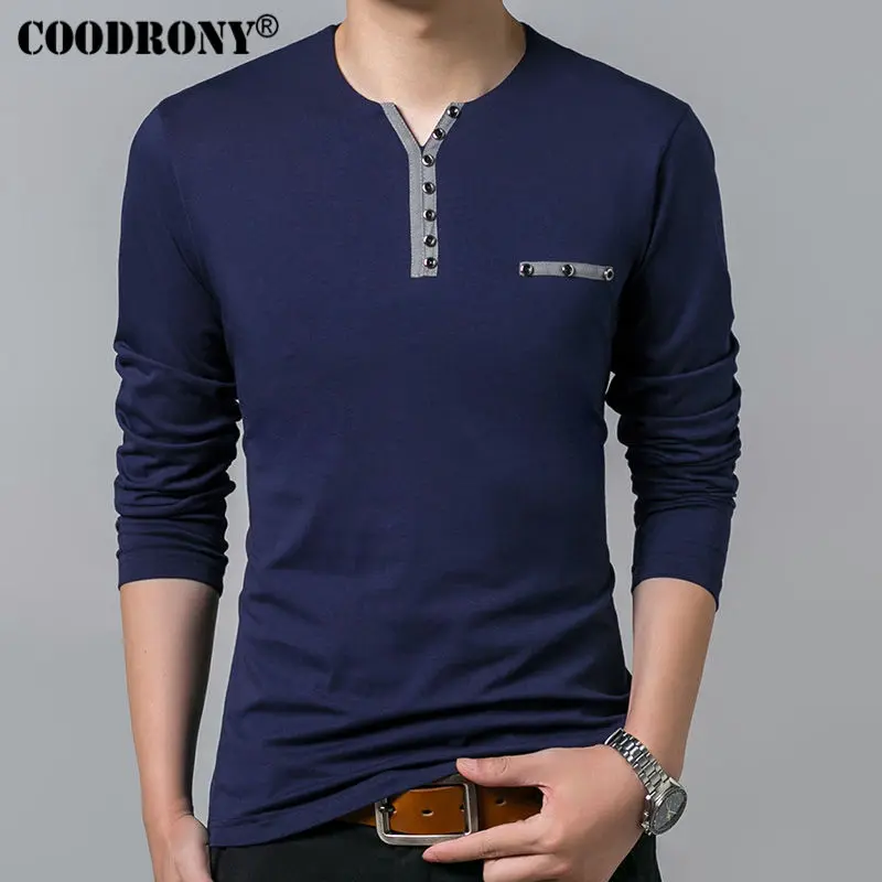 . (45% Off) Achat COODRONY coton T Shirt hommes 2019 printemps automne nouveau à manches longues T Shirt hommes Henry col T Shirt hommes mode décontracté hauts 7617 Pas Cher Prix.